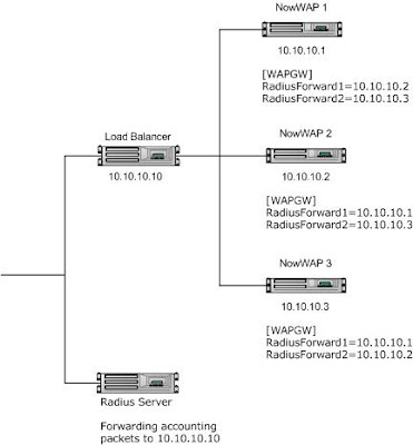 The access server is configured to send RADIUS accounting packets to the shared IP address. Based upon server availability, the load balancer will route the RADIUS accounting packet to one of the NowWAP servers (any of the servers could be used).